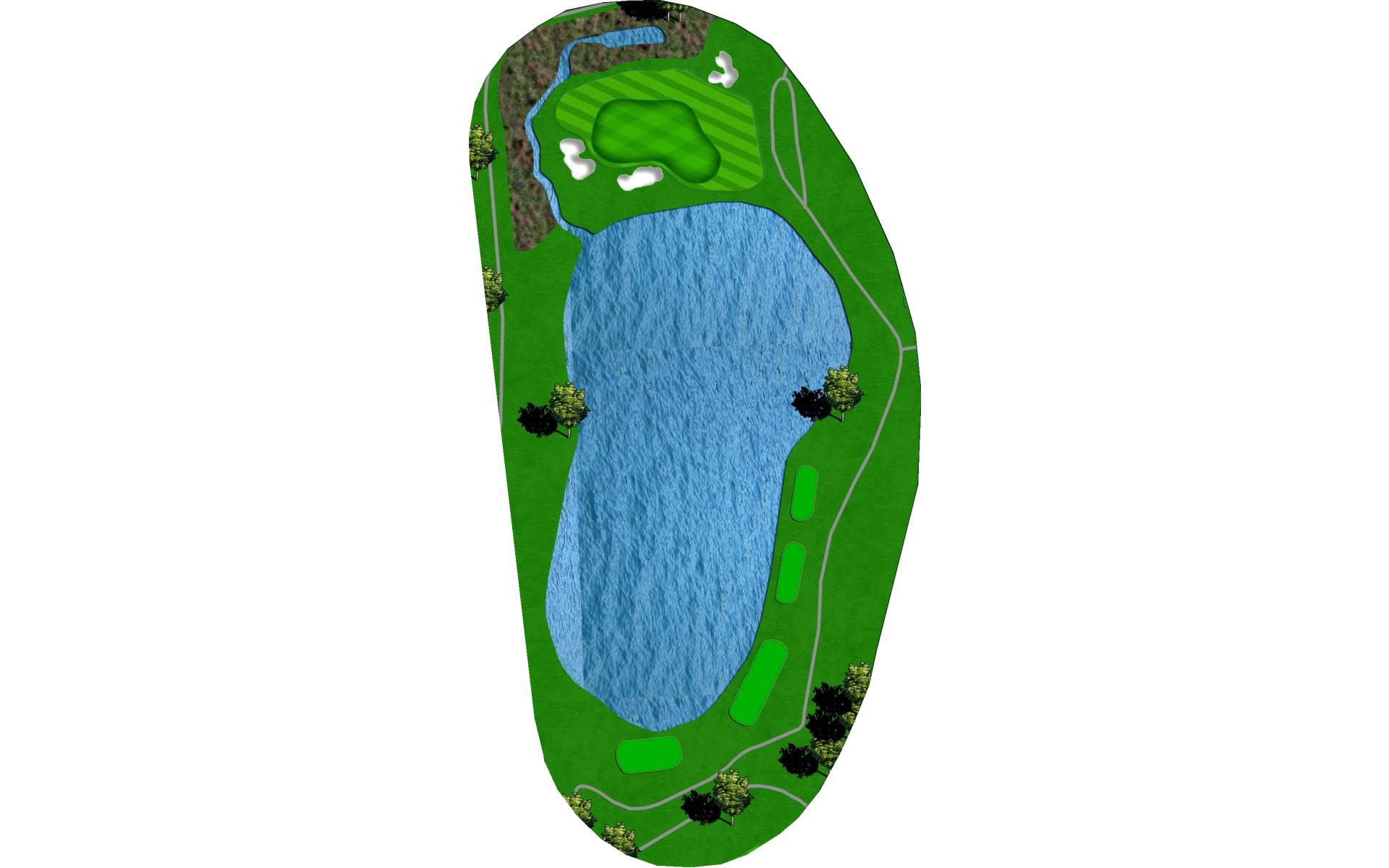 If playing from the blue tee, drive the ball over the stone yardage marker near the white tee. From the white tee, play a 175-yard shot to set up a short shot over water to the green.